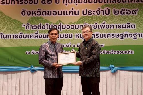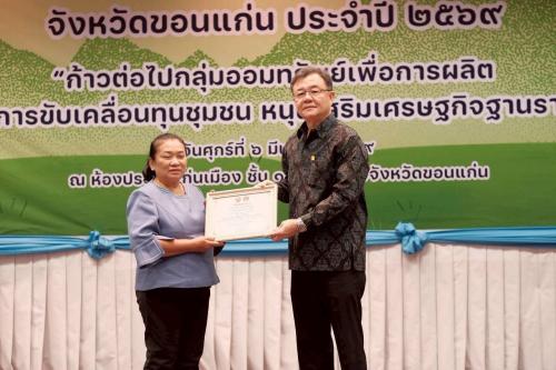 ** ในโอกาสนี้ ผู้ว่าราชการจังหวัดขอนแก่นได้ให้เกียรติ มอบเกียรติบัตรประกาศเกียรติคุณ แก่กลุ่มออมทรัพย์เพื่อการผลิตบ้านหนองแวงไร่ ตำบลในเมือง อำเภอบ้านไผ่ และเกียรติบัตรสมาชิกกลุ่มฯดีเด่น เพื่อเป็นขวัญและกำลังใจในการดำเนินงานกลุ่มออมทรัพย์ต่อไป